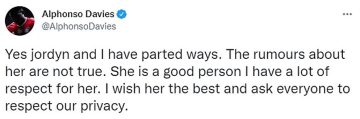 Bayern Munich defender Alphonso Davies has confirmed that he has broken up with PSG forward girlfriend Jordyn Huitema after nearly five years of dating.