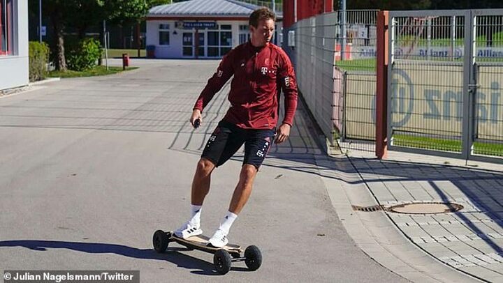 Last month the clip of Nagelsmann arriving at Bayern's training on a skateboard went viral. He laughs at the stir it caused.