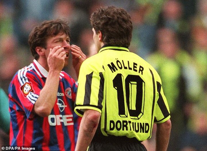 Bayern captain Lothar Matthaus made a gesture after a challenge with Andreas Moller, rubbing his eyes to suggest his Germany team-mate was soft when challenged. Moller responded by dragging his hands down Matthaus' face.