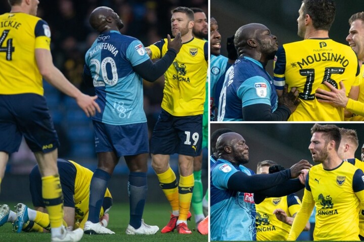 After a scuffle between the two groups of players started in the middle of the pitch, John Mousinho tried to push Akinfenwa away.