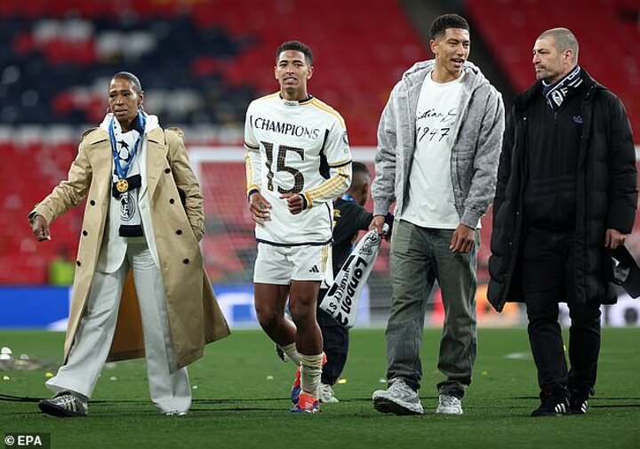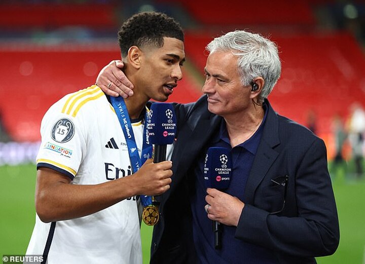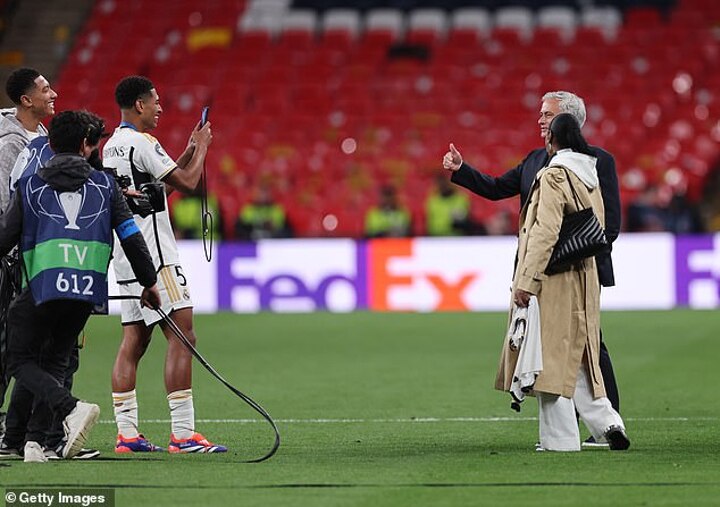 During the celebrations, Bellingham put his winners medal around the neck of his mother Denise before making a beeline for Mourinho, who was on broadcasting duties for TNT Sports.
