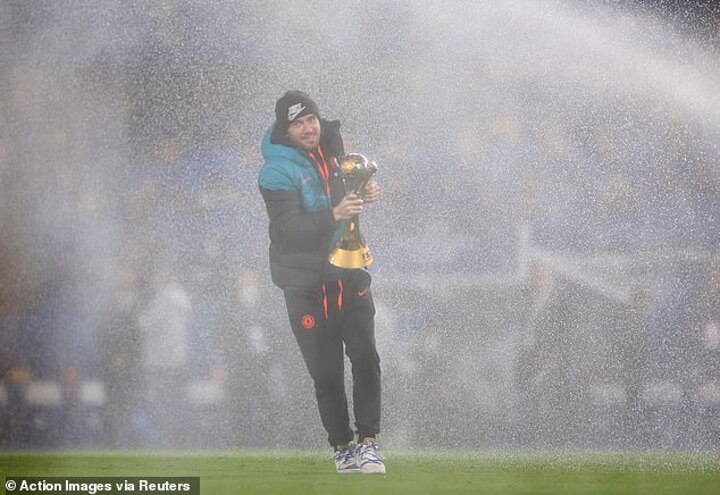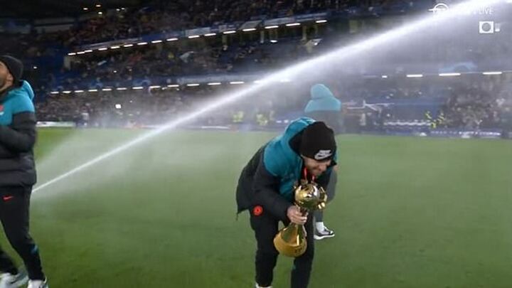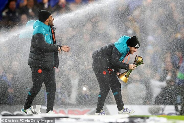 But as they strode on to the Stamford Bridge applauding and holding the trophy aloft, they were left soaked by the sprinklers as they watered the pitch pre-game.