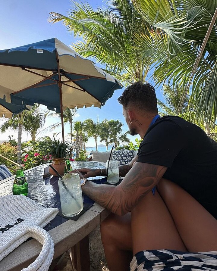 In a photo shared on Milly's Instagram, captioned: 'Life' with a blue heart emoji, White can be seen enjoying a cold drink, wearing a black and blue shirt as he takes in his surroundings.