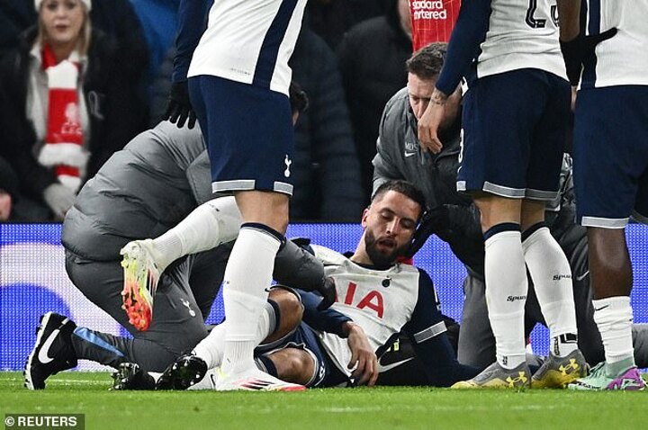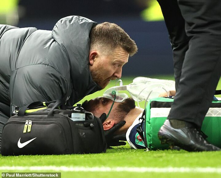 He dived to head Pedro Porro's corner, but appeared to land awkwardly, laying unmoved on the pitch as play continued, with Liverpool goalkeeper Alisson forced into action.