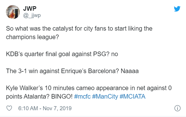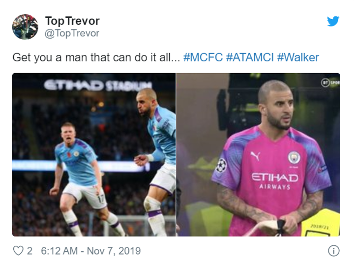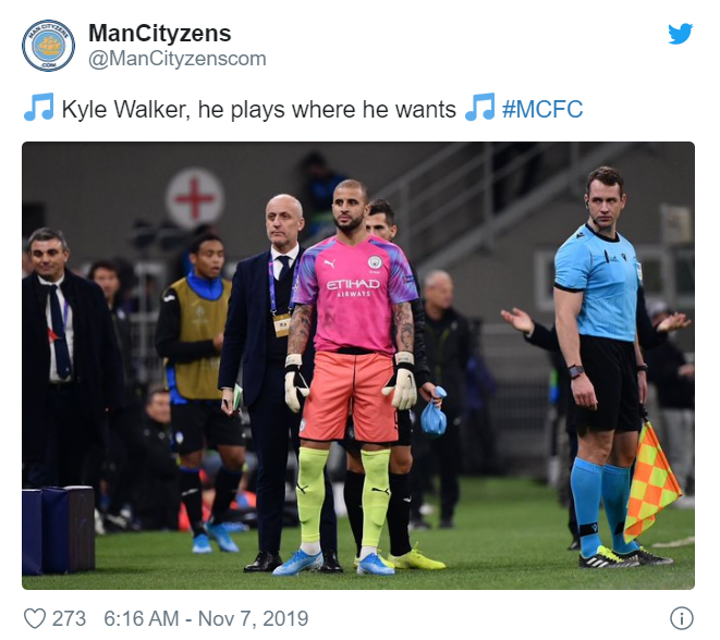 Manchester City fans are purring over Kyle Walker after his goalkeeping heroics against Atalanta in the Champions League.