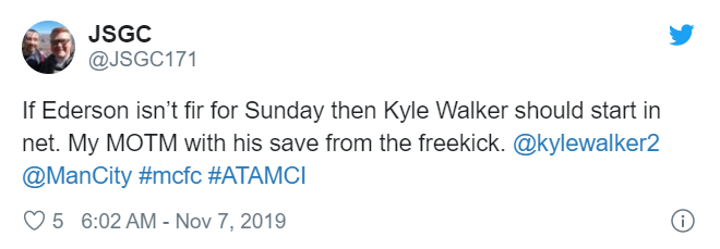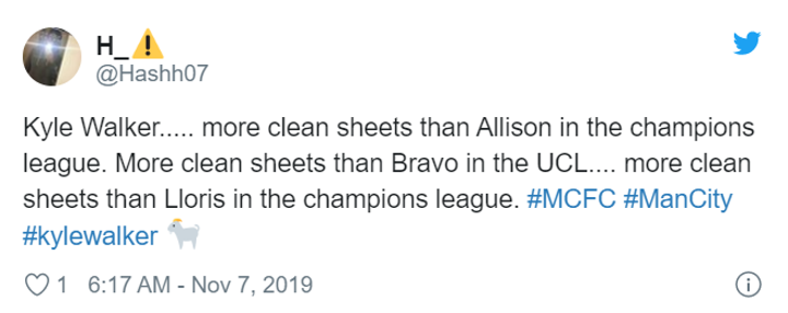 In hilarious circumstances, Walker recorded himself a clean sheet and actually recorded more saves (1) than both Ederson and Bravo during the match as he fumbled a routine free-kick before pouncing on the rebound.