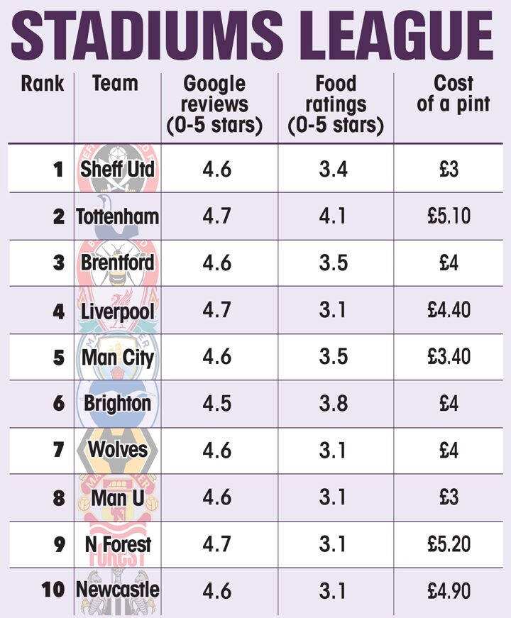 The Blades' 32,000-seat Bramall Lane came top of the table based on the cost of a pint, quality of food, atmosphere ratings and Google Reviews.