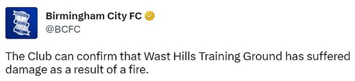 The club statement said: 'The club can confirm that Wast Hills Training Ground has suffered damage as a result of a fire.