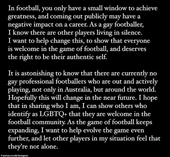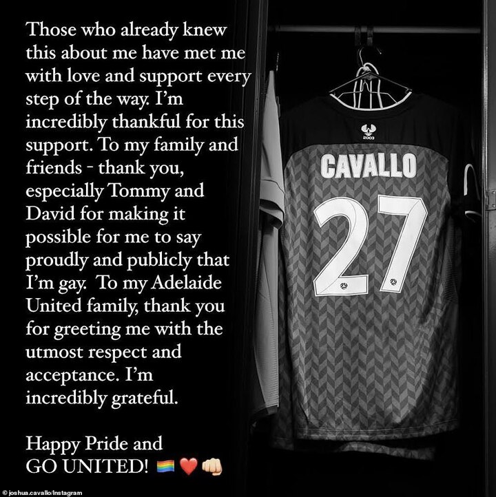 Josh Cavallo, 22, who plays for Australian team Adelaide United, came out as gay last year to then become the only out pro in the world.