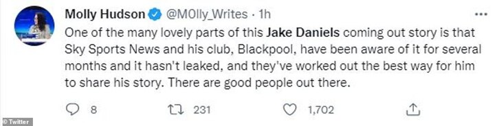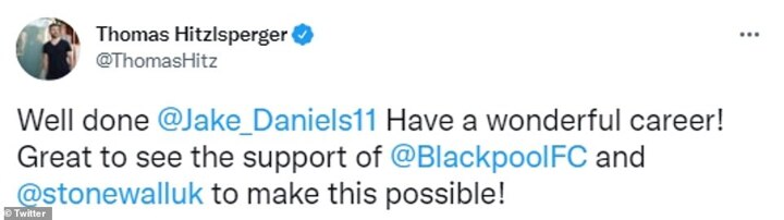 He wrote: 'Well done @JakeDaniels11 Have a wonderful career! Great to see the support of @BlackpoolFC and @stonewalluk to make this possible!'.