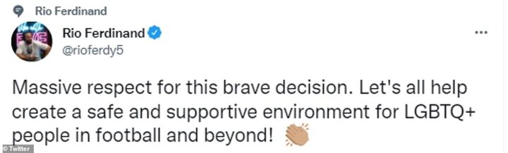 Ferdinand wrote on Twitter: 'Massive respect for this brave decision. Let's all help create a safe and supportive environment for LGBTQ+ people in football and beyond!'.