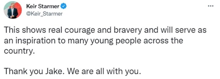 Labour leader Sir Keir Starmer tweeted: 'This shows real courage and bravery and will serve as an inspiration to many young people across the country. Thank you Jake. We are all with you.'