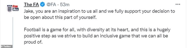 The Professional Footballers' Association also added: 'We are extremely proud of Jake and have been working with him and his club. He has the complete support of everyone at the PFA.'