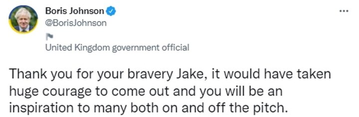 Mr Johnson tweeted: 'Thank you for your bravery Jake, it would have taken huge courage to come out and you will be an inspiration to many both on and off the pitch.'
