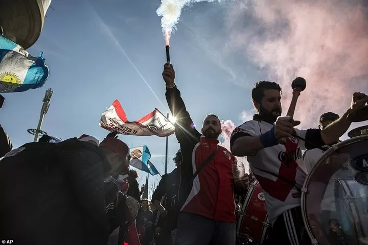 So far, the crowds gathered in Madrid have remained peaceful, with swathes of blue and yellow for the Boca supporters and red and white for the River Plate supporters.