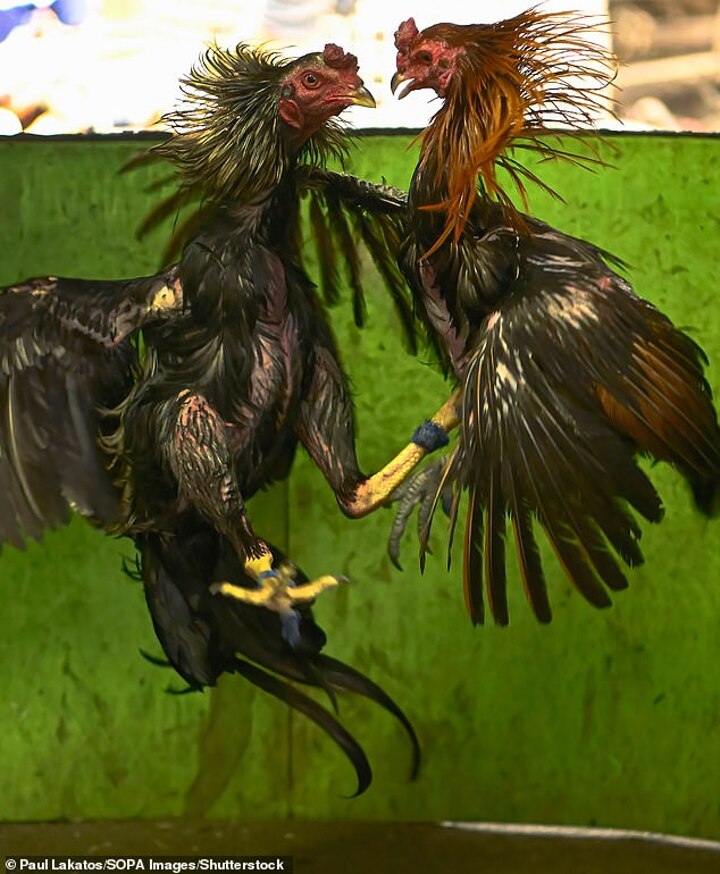 The blood 'sport' sees blades attached to the ankles of cockerels who are then wound up to attack and kill one another as spectators bet on the outcome.