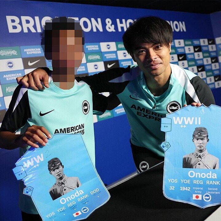 A post on X showed Japanese forward Kaoru Mitoma alongside a player from the club's academy, with the pair holding a football card that featured Hiroo Onoda.