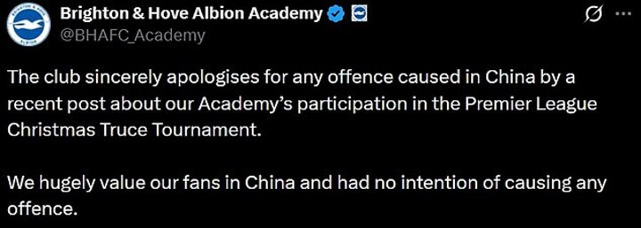 Brighton's post subsequently caused a huge furore on social media, particularly in China, with fans expressing anger and disappointment.