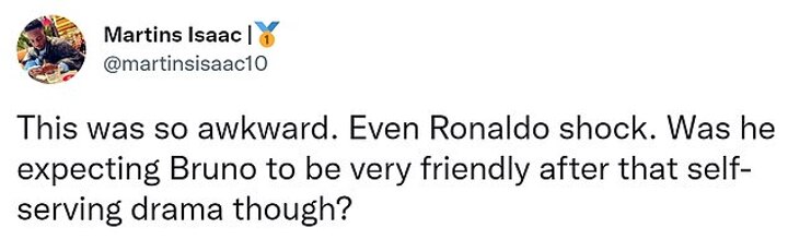 Another noted the dynamics of the exchange, writing: 'Bruno wasn't going to shake hands if Ronaldo didn't reach out, and he clearly had his face down [throughout], which clearly means he wasn't interested in shaking hands if Ronaldo didn't reach out.'