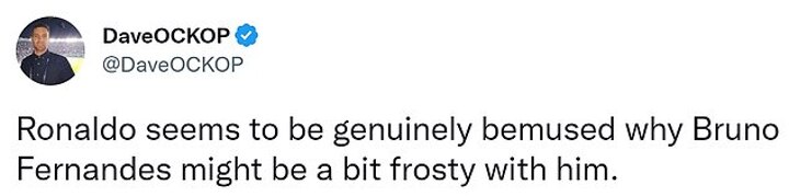 Meanwhile another added: 'Ronaldo seems to be genuinely bemused why Bruno Fernandes might be a bit frosty with him.'