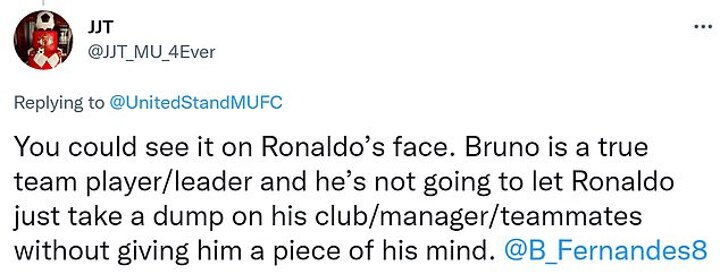 'You could see it on Ronaldo's face. Bruno is a true team player/leader and he's not going to let Ronaldo just take a dump on his club/manager/team-mates without giving him a piece of his mind,' one noted.