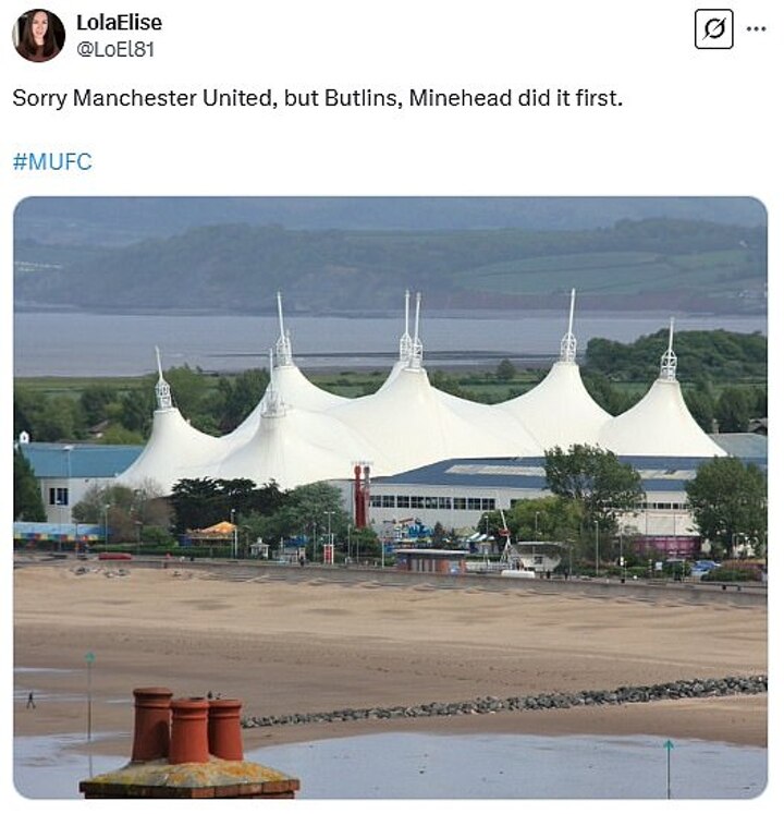 A third, accompanying their post with a glut of laughing emojis, added: 'Who else thinks Manchester United's new stadium design looks like Minehead Butlins?'