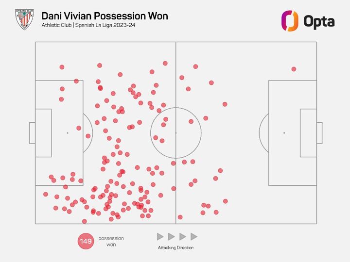 Vivian has recovered possession an average of 7.5 times per 90 in LaLiga this season, the most of any centre back. Wrapped up in that headline figure is the combination of seizing on possession in distinct scenarios; namely the split between winning the foot race when the opposition try to play over the top of Athletic and recouping the ball in higher areas once they’ve squeezed the imprecision from their opponent. Not limited to just the former, Vivian has recovered the ball more often in the middle third of the pitch than any other centre back in La Liga this term too (3.2 times per 90).