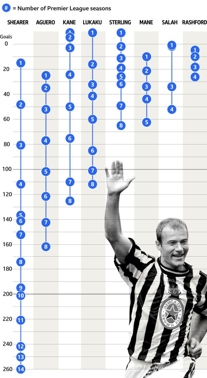 But how do Shearer's goals break down across his 14 seasons and how do the current tallies of the leading candidates looking to emulate him stack up?
