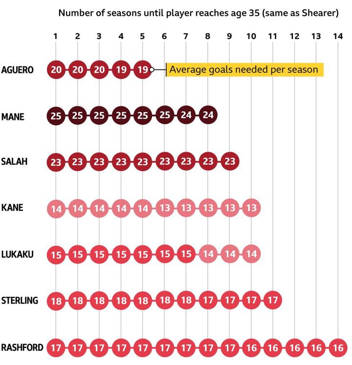 For the fairest purposes of showing what each needs to do to beat the record, we're presuming each plays in the Premier League until the first season in which they are 35 years old, matching the age at which Shearer ended his English top-flight career.