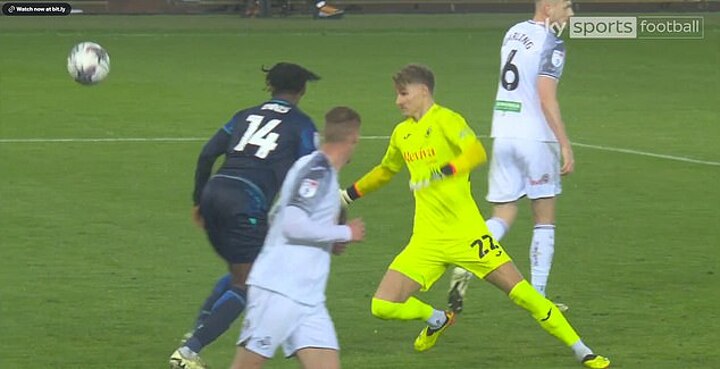 The game's controversial moment started with Swansea goalkeeper Carl Rushworth collecting an over-hit through ball, before the 22-year-old then looked up to try and start an attack for the hosts.