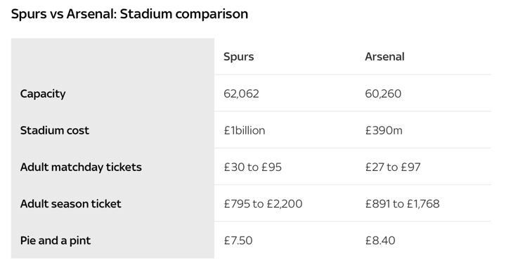 Spurs Arsenal Capacity 62,062 60,260 Stadium cost £1billion £390m Adult matchday tickets £30 to £95 £27 to £97 Adult season ticket £795 to £2,200 £891 to £1,768 Pie and a pint £7.50 £8.40