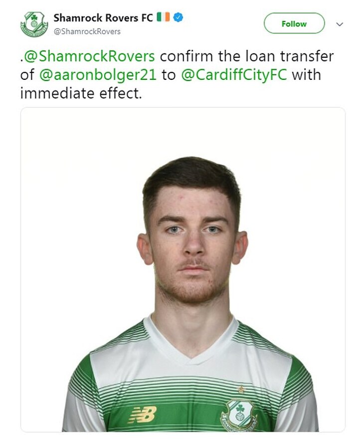 '@ShamrockRovers confirm the loan transfer of @aaronbolger21 to @CardiffCityFC with immediate effect,' the Dublin club posted on their official Twitter account.
