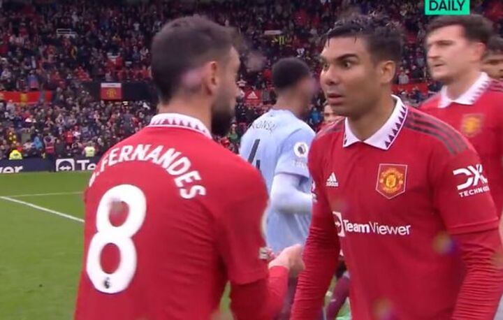 In scenes reminiscent of the duo's fiery on-field debrief after United's Carabao Cup triumph back in February, Casemiro could be seen wide-eyed and agitated during the chat with Fernandes before Harry Maguire approached them.