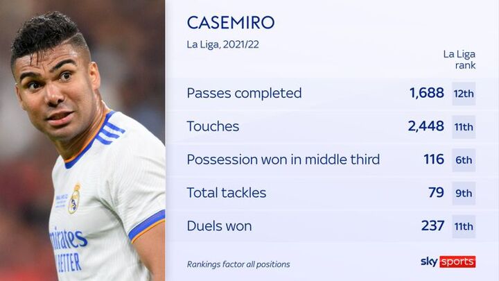 Casemiro excels in the No 6 destroyer role, ranking among the elite for reclaiming possession in the middle third and winning tackles and duels in La Liga last season.