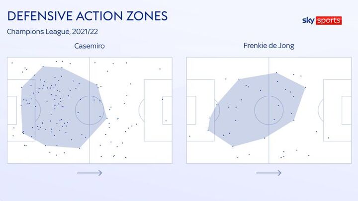 The Brazilian provides a shield of cover for his defence, whereas De Jong makes defensive actions evenly between both boxes and has a lower ratio of actions in the graphic below - having played only 523 minutes in the Champions League last term, compared with Casemiro's 914.