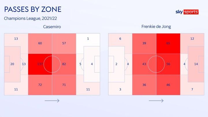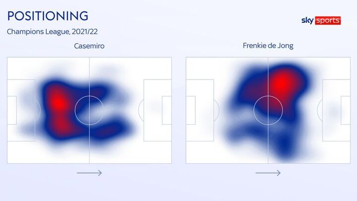 Heat maps from the players' performances in the Champions League last season clearly show how De Jong is typically deployed in a more advanced, left-of-centre, role, whereas Casemiro sits far deeper.