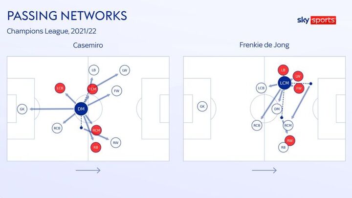 The passing networks below highlight how Casemiro has been Real's deep distribution hub, compared with De Jong's attacking combinations down the left of Barcelona's attack.
