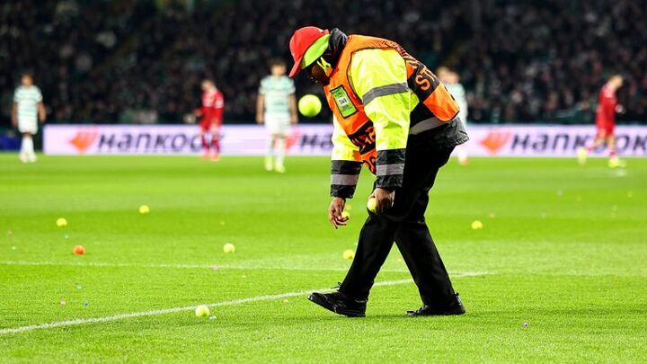 It took around four minutes to clear up all the toy balls which had been thrown onto the pitch in protest at the club's owners.