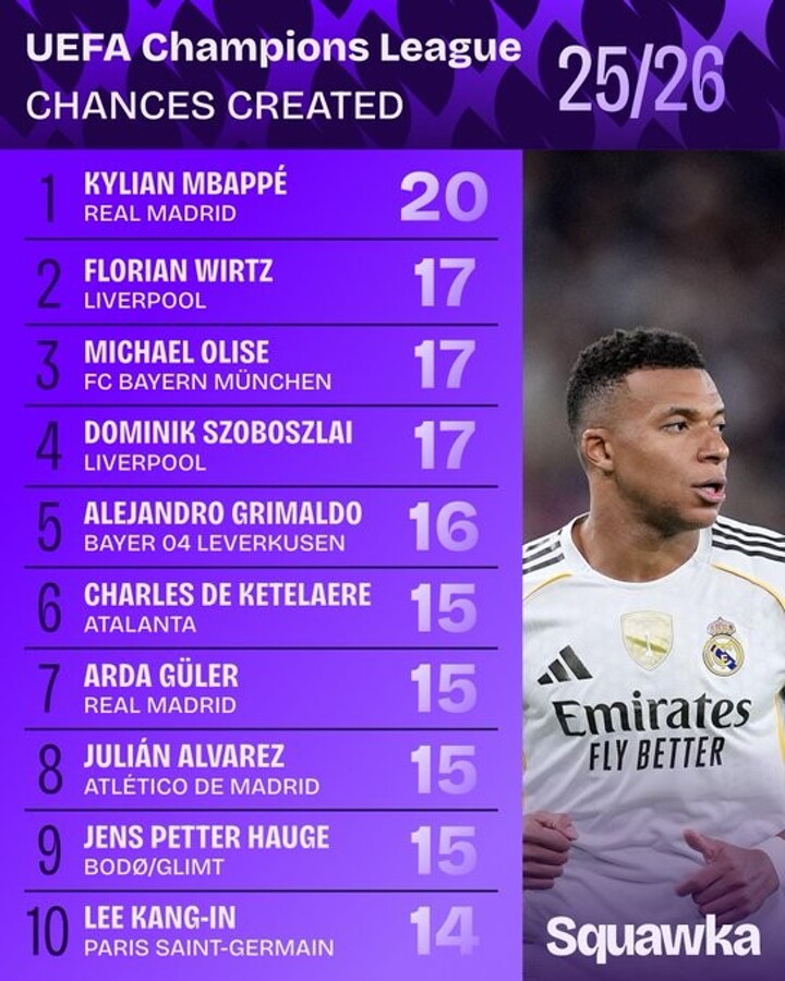 Champions League chances created rankings: Mbappé tops the list, Wirtz second