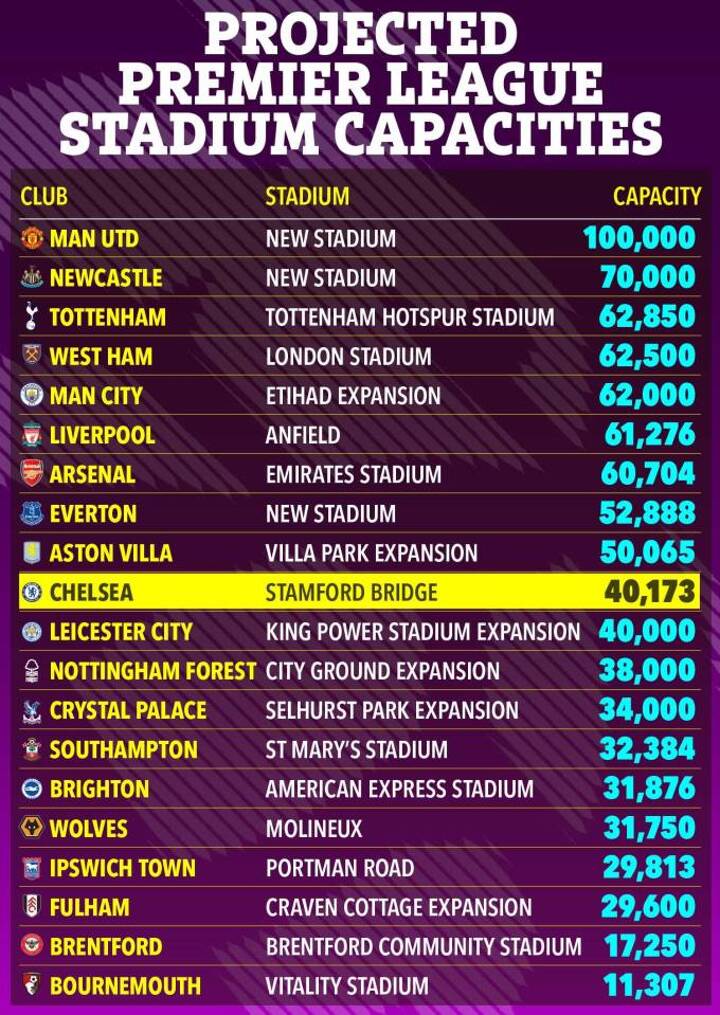 West Ham (62,500), Manchester City (52,900), Newcastle (52,258) and Aston Villa (42,918) all have bigger grounds than Chelsea - as do Championship side Sunderland (48,095).