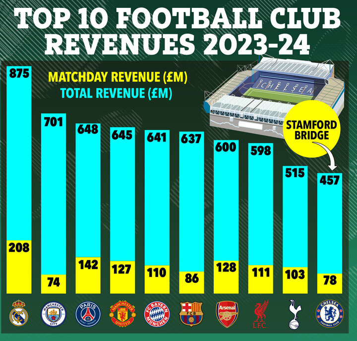 The latest Deloitte Football Money League reported Chelsea’s overall revenue dropped seven per cent in the 2023-24 season to £457m - tenth in the world but behind the rest of the 'Big Six' - with £78m coming from matchday revenue.