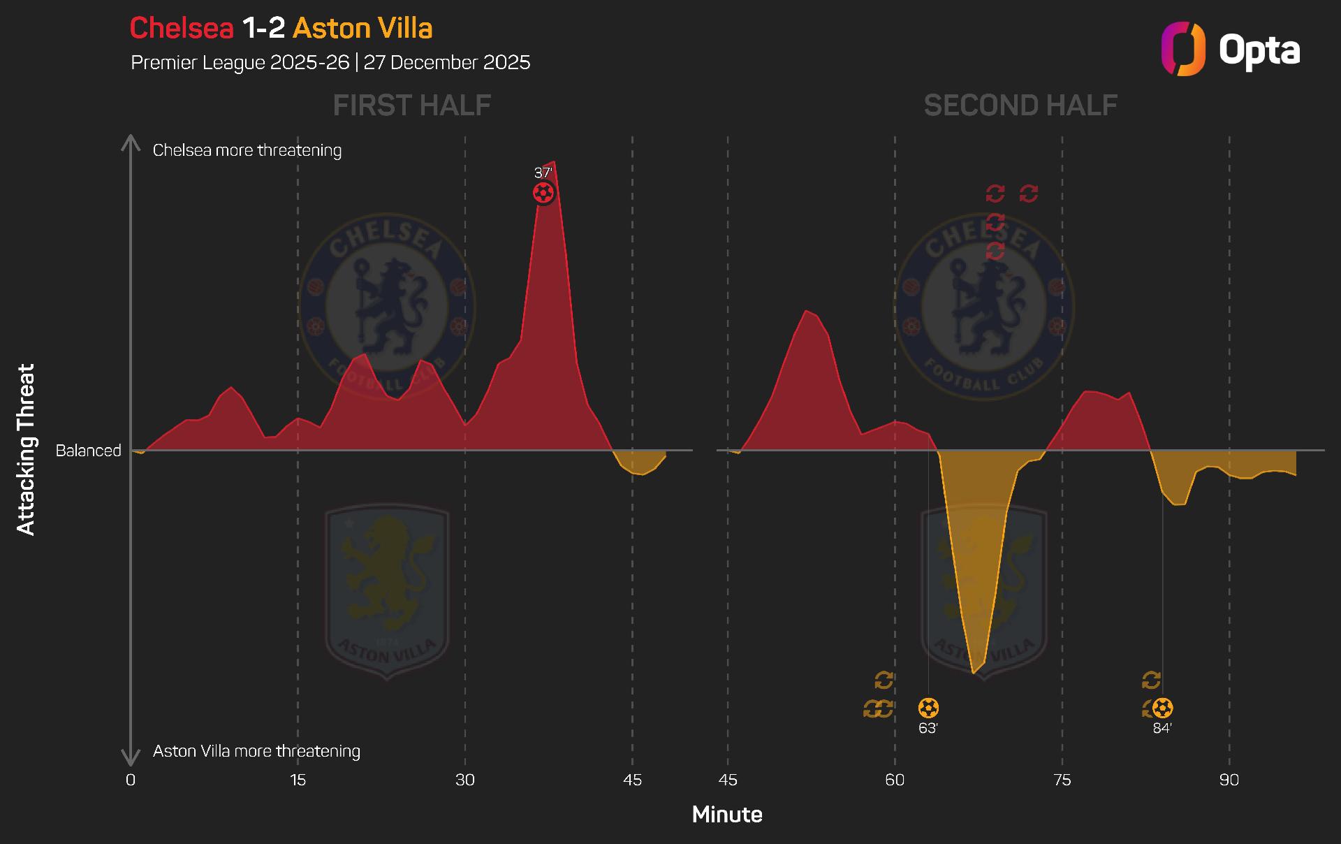 But in the second period, Villa were comfortably the superior side when it came to shots (11 to four) and xG (1.05 to 0.16), while almost matching Chelsea for touches in the area (14 to 16).
