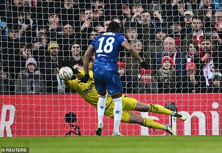 Burgoyne, whose career has featured loan adventures from Lowestoft to Falkirk to Corby Town, saved Nkunku’s kick and produced another excellent block from Felix a few minutes later.