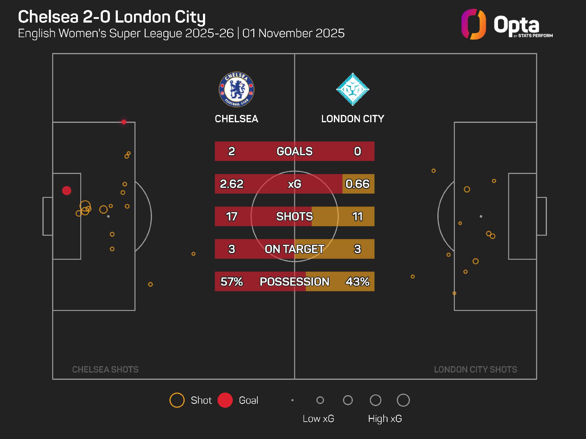 Chelsea were far from their very best against London City, registering an expected goals (xG) total of 2.62 from their 17 shots, though only three were on target, compared to their opponents' 0.66 from the same number of attempts at goal.