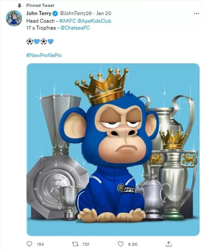 Terry, along with other Premier League greats including former Chelsea and England team-mate Cole, have been endorsing the 'Ape Kids Club' NFTs on Twitter.