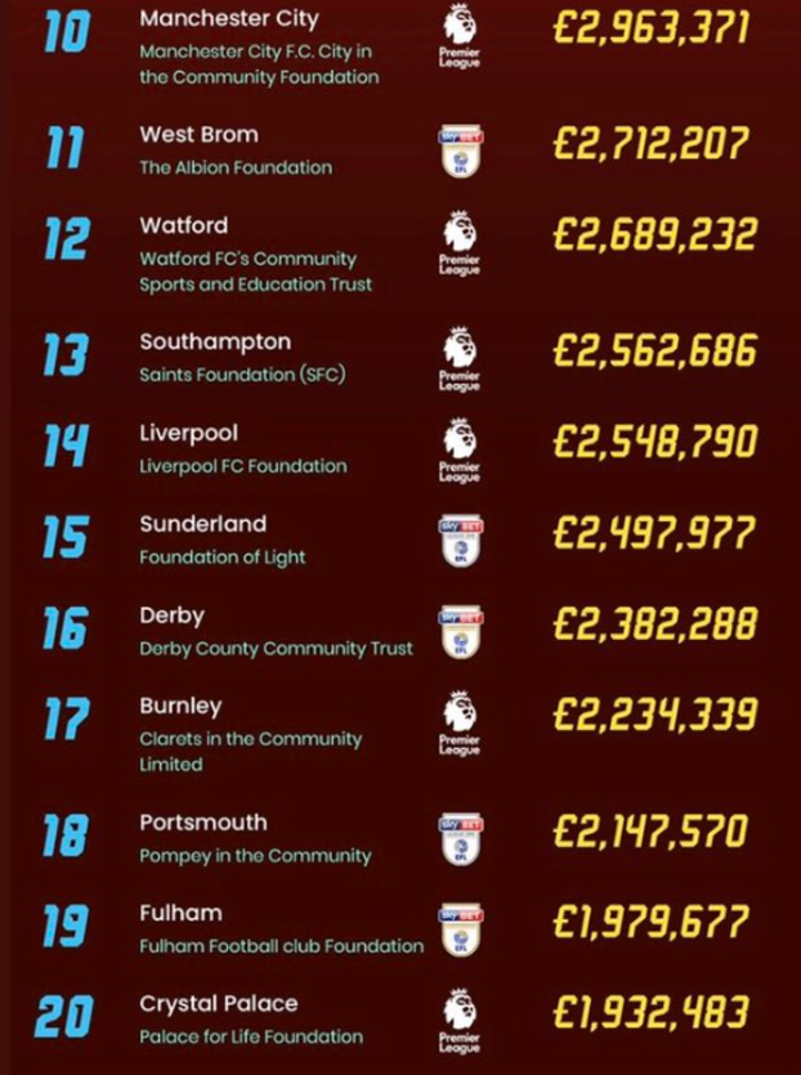 And amazingly, second tier Charlton are second only to Chelsea, having contributed £5,586,000 through their South of England Foundation.