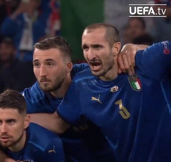 Slow motion footage captured of the Azzurri's players during the moment Donnarumma clinched them the trophy shows Chiellini mouthing it, before the 36-year-old then races away to celebrate.