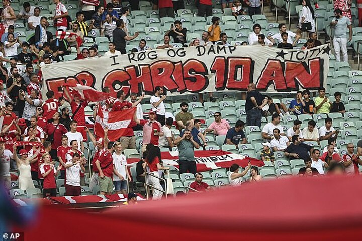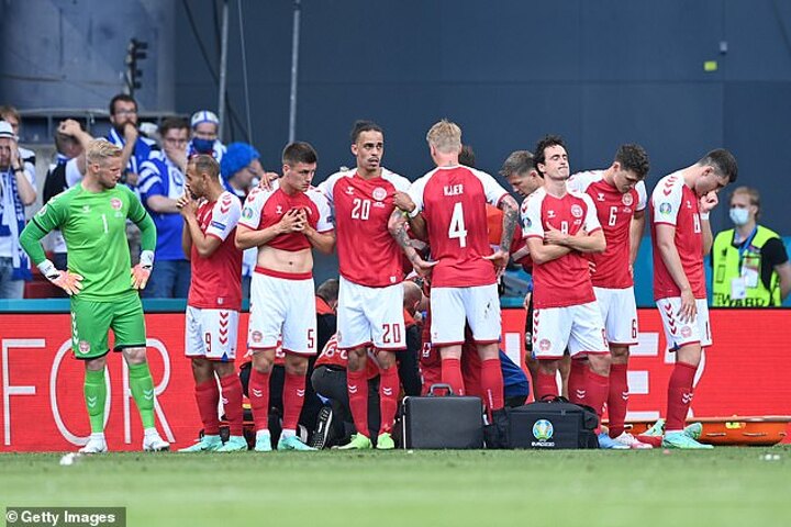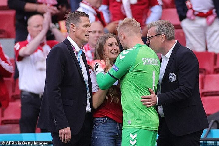 His brave team-mates instantly surrounded him to prevent prying cameras seeing their stricken friend, captain Simon Kjaer and goalkeeper Kasper Schmeichel embracing Eriksen's tearful partner Sabrina Kvist Jensen in a powerful moment.