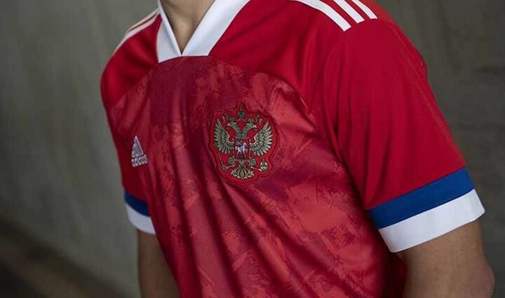 The bold colours of Russia's flag are represented here, and the blue and white detail on the sleeves is a symbol of the unity between players and fans.