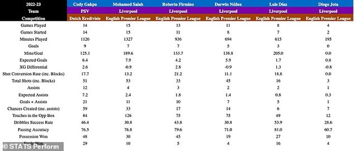 Gakpo has out-scored all of Liverpool's existing forwards for league goals this season - Salah and Firmino have seven, Nunez has five, Diaz three and Jota none.
